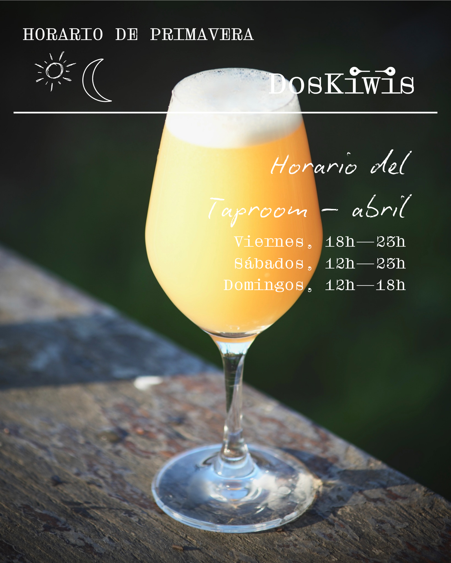 Con el cambio de hora, ampliamos los horarios de fin de semana durante todo abril: Viernes 18h-23h, Sábados 12h-23h, Domingos 12h-18h. ¡Ven a disfrutar de una cerveza al sol!